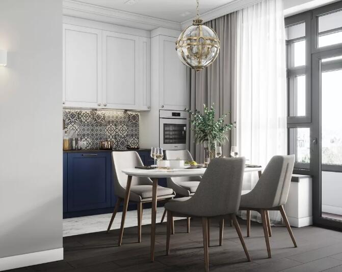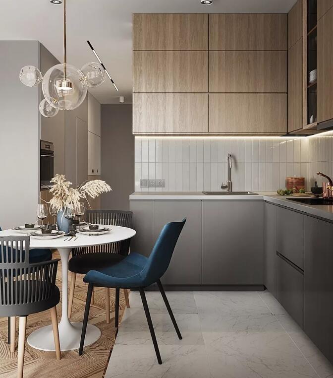 在L早餐桌设置在厨房,可以有效利用剩余位置,也可以分担厨房功能压力的一部分,类似于小酒吧,但桌子更灵活,可以根据实际剩余面积和居民使用,面对成长家庭,家庭成员和结构可能会有更大的变化,这样的设计更可伸缩。
