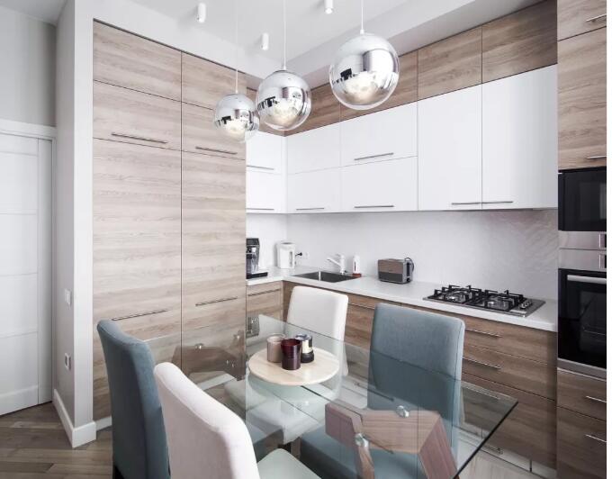 冰箱、烤箱、微波炉、洗碗机......厨房电器越来越多,在一些小家庭的设计中,选择把洗衣机放在厨房里。所以电器应该尽可能容纳在橱柜里,让桌子看起来更放松。特别是在L在类型厨房中,当电器嵌入到适当的位置时,在使用时不会相互干扰,从而大大提高效率。