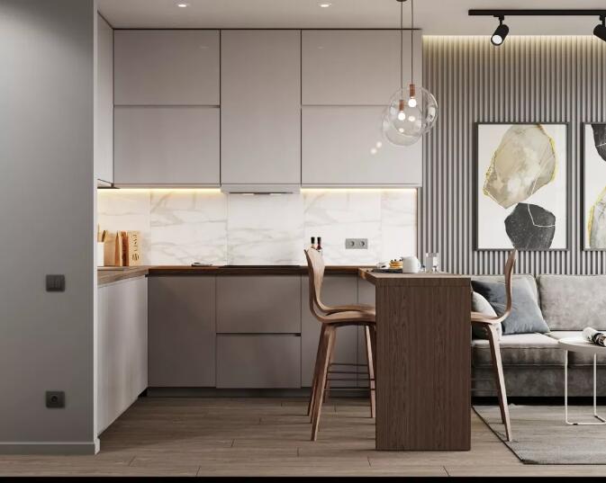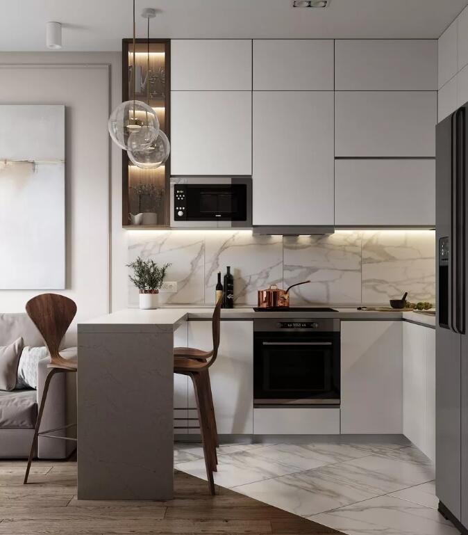 在L在厨房里设置一个简单的小酒吧,不仅会让空间立即充满小资产阶级的情感吸引力,符合当前对精致生活的追求。此外,你可以更合理地利用家里的鸡肋空间,划分一个新的功能区域,在这里你可以完成日常活动,如传播蔬菜,吃饭,并分享厨房的一些功能。