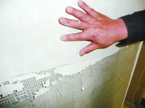 漏水回迁房又曝“墙掉掉” 整修漏水房屋发现墙内网布不粘着保温层,业主质疑回迁房商品房双重标准昨日,韩先生展示轻易就能扯掉的墙面。24号楼2单元6层业主韩先...