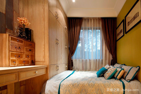2.双层橱柜创造了更多的存储功能。连接衣柜,儿童房规划双层存放书柜,内层固定书柜用于存放阅读较少的书籍,外层移动书柜可存放书籍以外的杂物。
